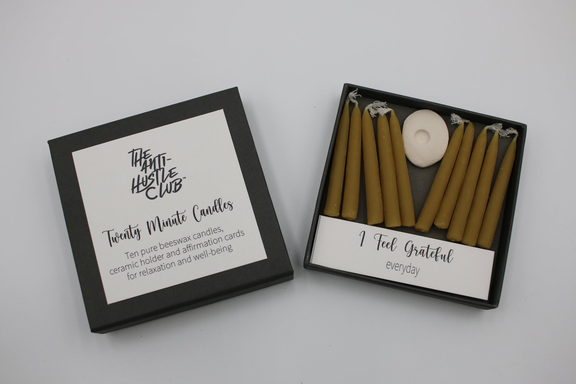 Each box contains 12 x Twenty Minute Candles and a ceramic holder for relaxation, meditation, mindfulness and well-being. 100% pure beeswax.